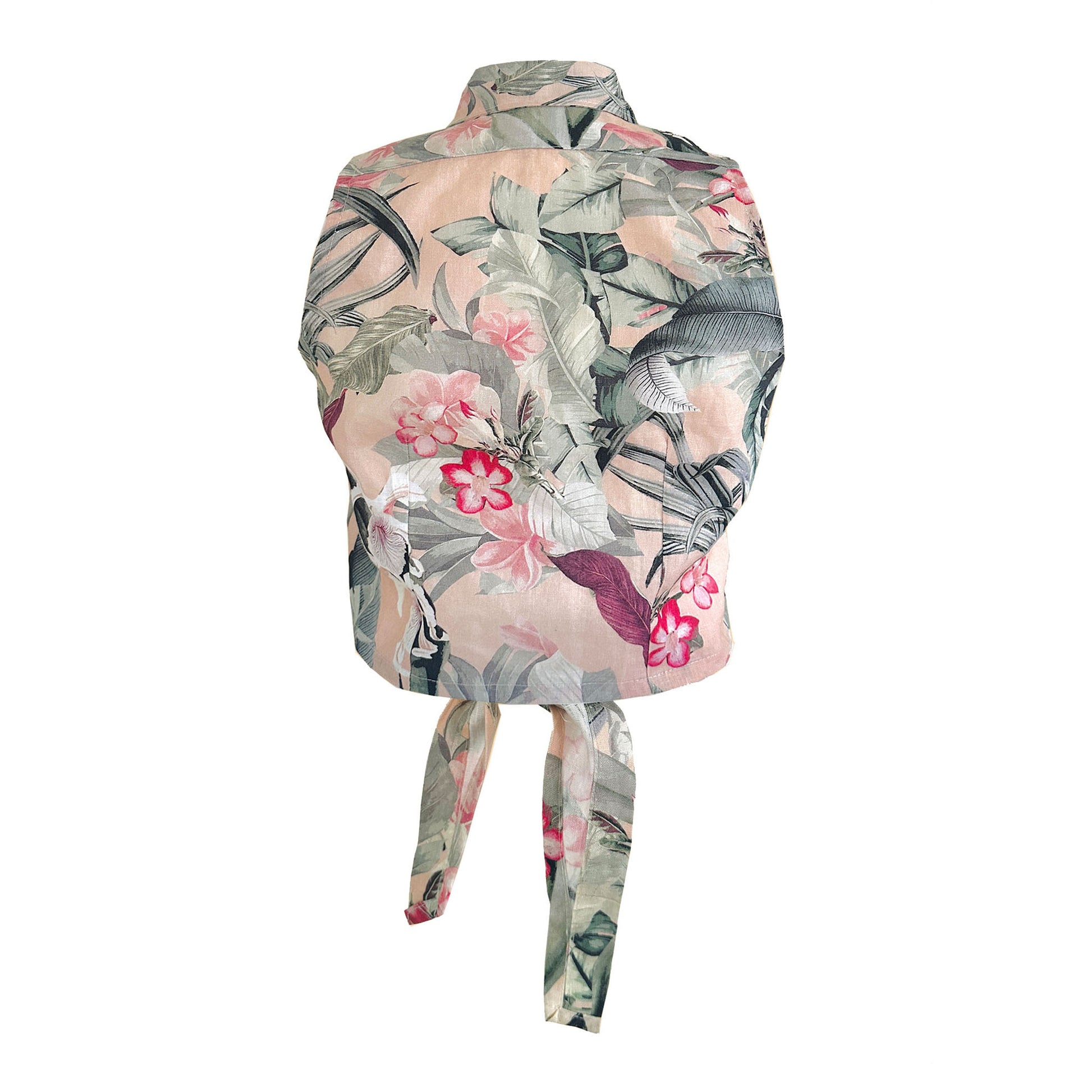 Lush linen woman's blouse with printed jungle leaves and tropical florals on chic pastel pink.
