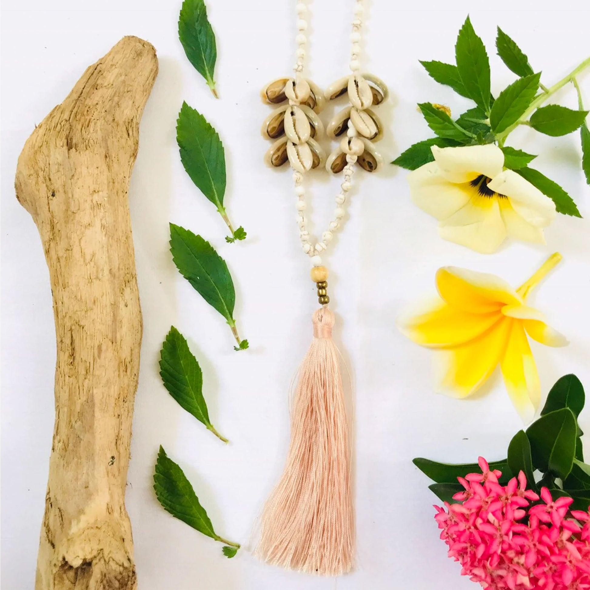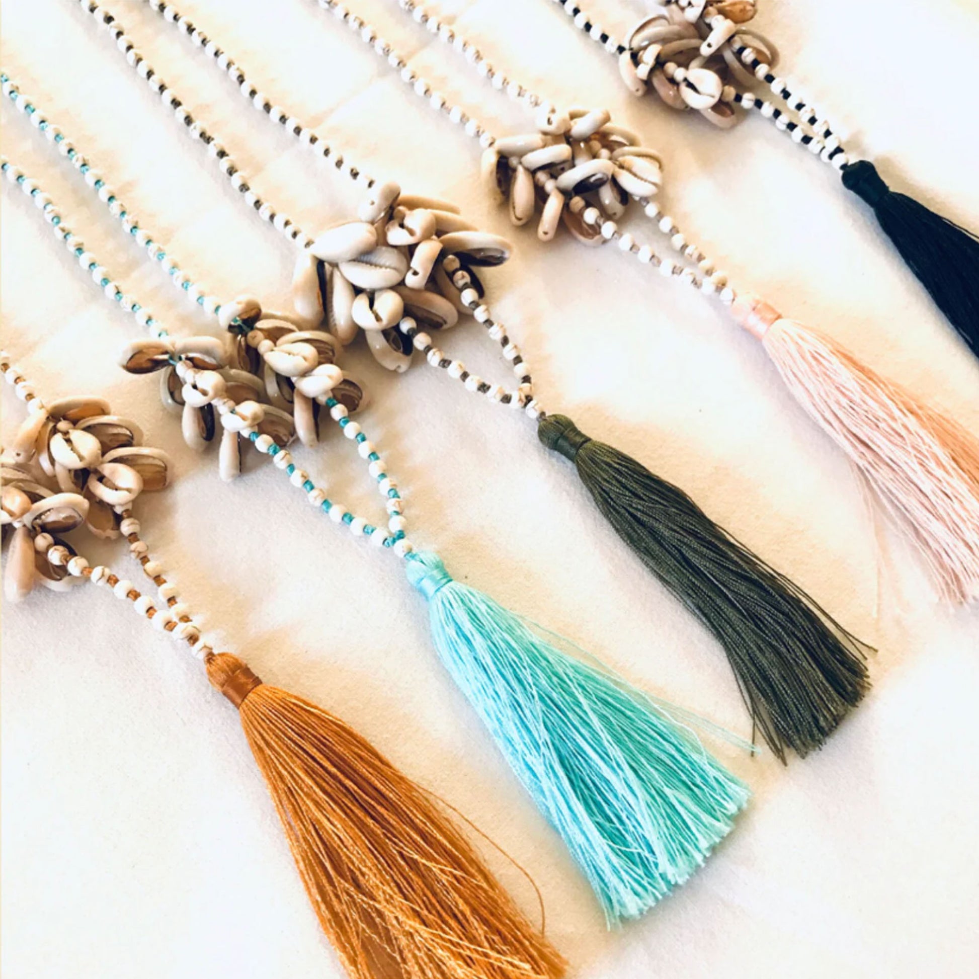Lush handmade cowry shell necklace with Howlite stone and cute tassel mala
